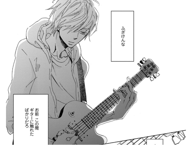 音楽雑誌の編集者とギタリストのカップル。出会いは10代、学生時代にさかのぼる。「何者でもない」頃から、お互いに自分のめざすべき道を見つけ、音楽で身を立てるようになるまでの人生ドラマ×BL。受けが一途に攻めを思い続ける王道恋愛パターン。エロ多め。